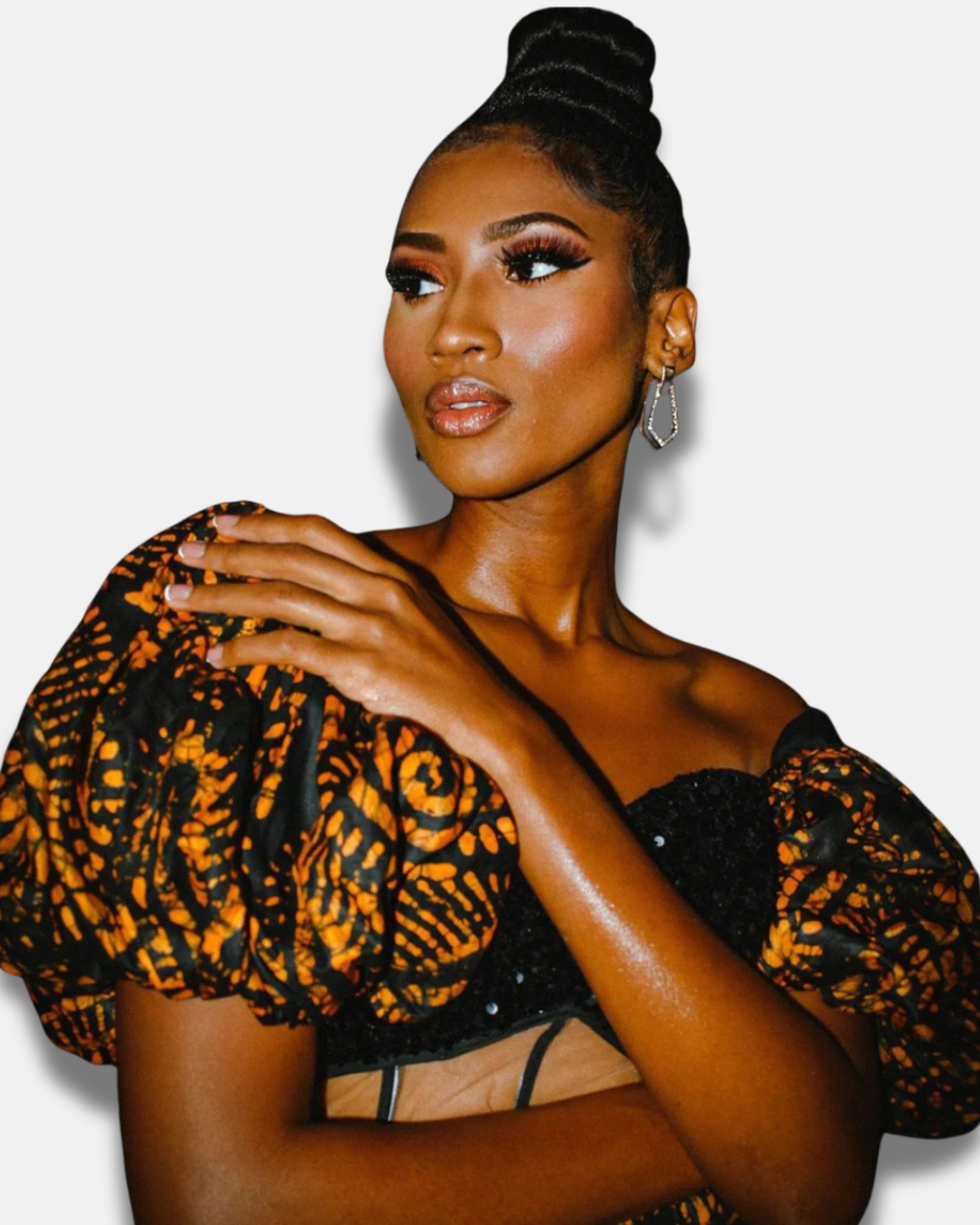 This Custom Velvet & Batik Kindeli Gown is handcrafted by Fatima Camara, the designer herself, using haute couture techniques that honor both tradition and innovation. Crafted from luxurious velvet and handmade batik fabric sourced from Guinea, each gown is shaped through meticulous draping, including sculptural balloon sleeves that command presence with quiet authority.